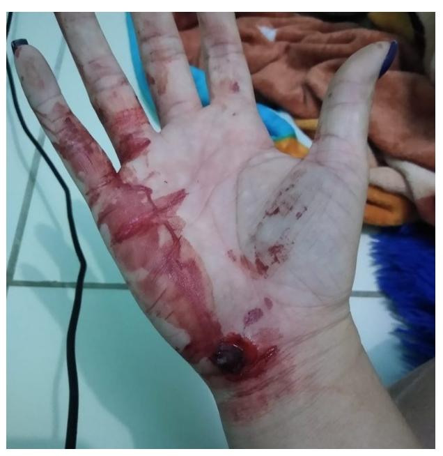 A moça usou as mãos para se proteger da queda ao se jogar do veículo e divulgou algumas fotos