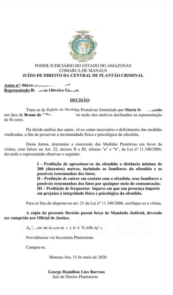 Ela relatou que estava bastante aflita e mostrou a grade de seu apartamento que precisa estar com dois cadeados e corrente. “Ele tá mandando um monte de mensagem. Ele quer ser o dono da minha vida, saber onde eu estou. Estamos em desespero. A pessoa que faz isso ela é capaz de tudo. Não tem medo de medida protetiva. Ele continua me mandando mensagem, roubou coisas aqui de casa, além de ser agressor e traido”, explicou ela.Maria mostrou a foto de uma agressão e o documento expedido pelo Tribunal de Justiça do Amazonas (TJAM) sobre a medida protetiva deferida pelo juiz George Hamilton Lins Barroso, no dia 15 de maio de 2020. “Depois dele ter me traído e eu ter visto tudo, foram várias vezes, ainda foi lá e tatuou meu nome no braço dele”.