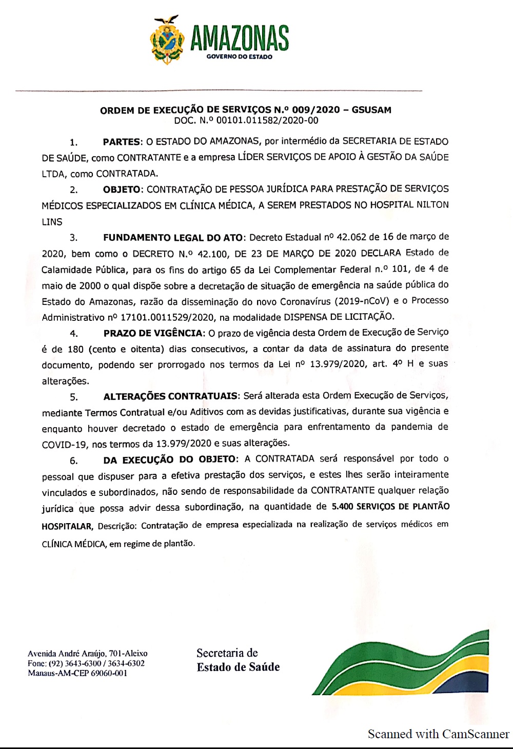Dr. Marcos relatou que; através de processo cotação a empresa Líder fechou contrato em R$ 1.0650,00 ( Um milhão e Seiscentos e Cinquenta Mil) para prestar os serviços, mas que apenas foi emitida uma nota no valor de R$800,00 mil, depois disso, nada mais foi pago. Os médicos só receberam o primeiro mês de trabalho. Hoje, os médicos cobram até mesmo em tom ameaçador. Tivemos acesso em algumas conversas, e uma delas, o médico doente implora pelo pagamento. Lamentável a situação do nosso profissional da saúde no Amazonas.