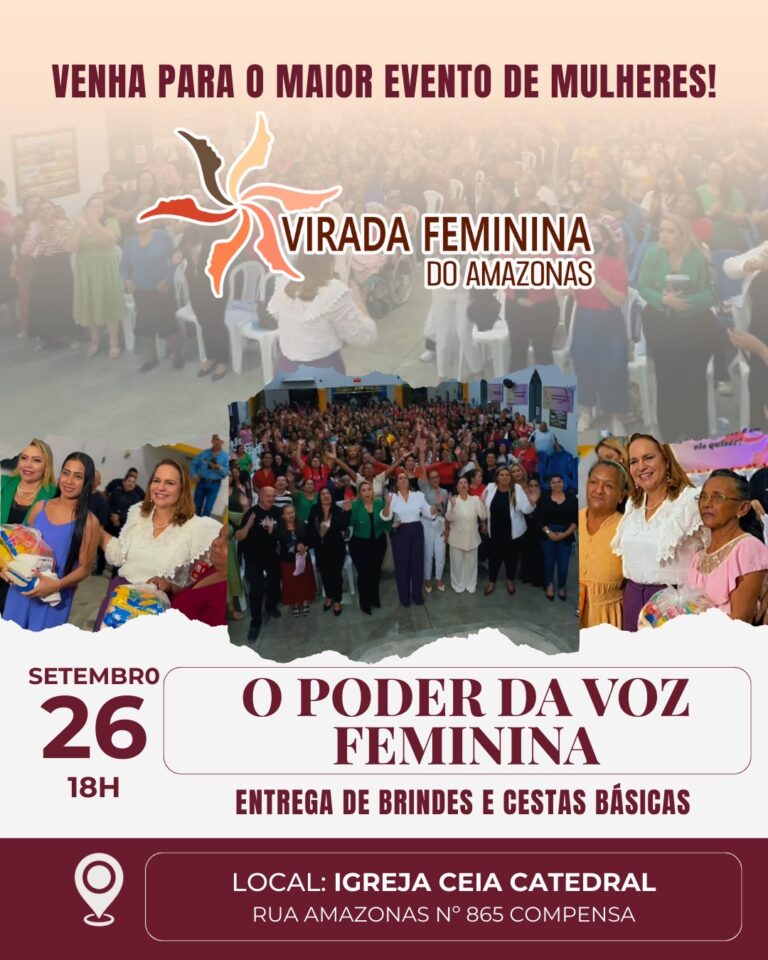 Depois do sucesso do primeiro grande encontro realizado em Manaus, que impactou mais de 600 mulheres com uma noite de fé, testemunhos e transformação, a Virada Feminina do Amazonas promove nesta sexta-feira (26), às 18h, o evento “O Poder da Voz Feminina”, no bairro Compensa, zona Oeste da capital.