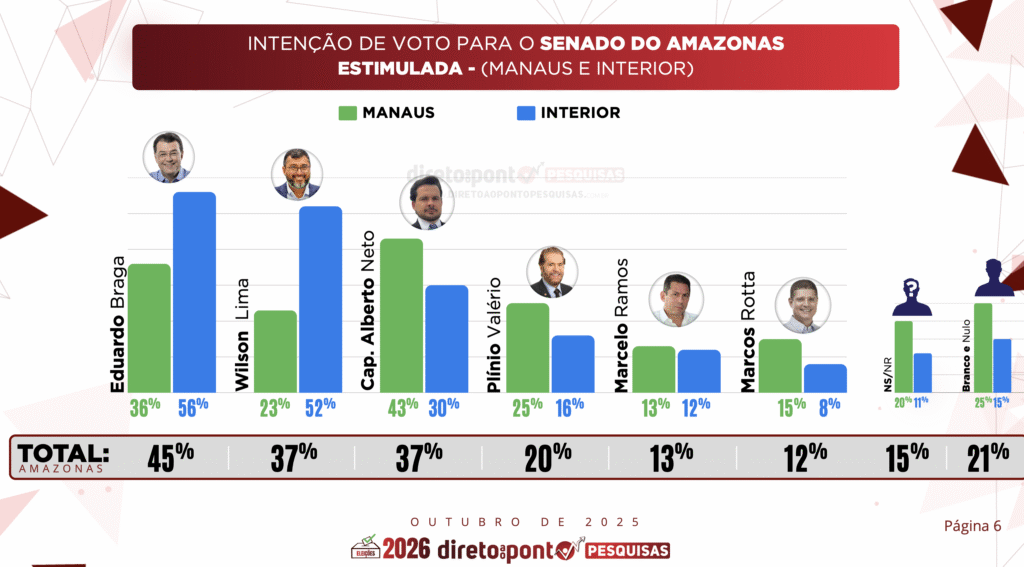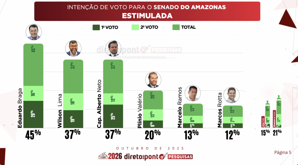 Uma nova pesquisa eleitoral do Instituto Direto ao Ponto Pesquisas, realizada entre 1º e 8 de outubro de 2025, aponta que o senador Eduardo Braga (MDB) segue como o nome preferido dos eleitores do Amazonas para o Senado Federal.