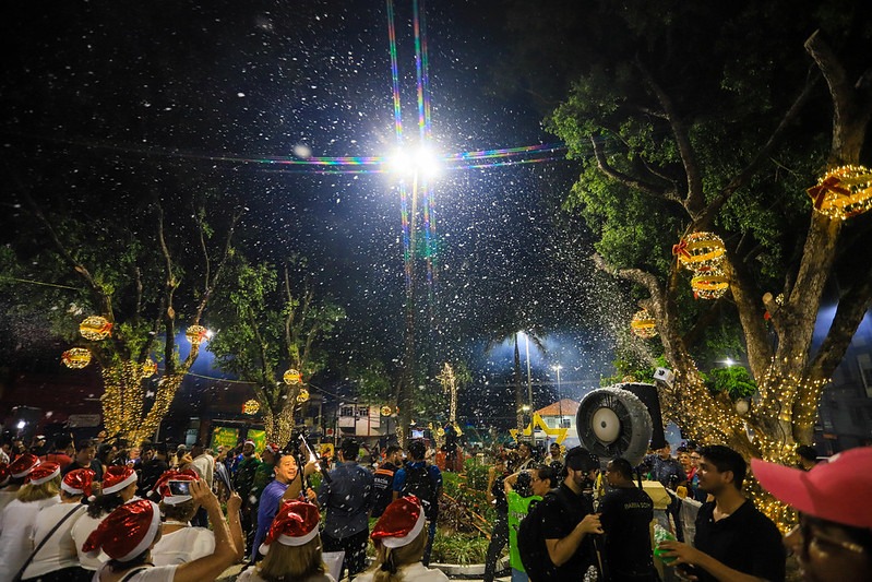 A programação contou com a chegada do Papai Noel e com a emocionante apresentação de um grupo de coral de idosas da Fundação de Apoio ao Idoso Dr. Thomas (FDT), que levou o sentimento de ternura e celebração ao público presente. Em seguida, houve o acendimento das luzes dos ornamentos natalinos distribuídos pela praça, seguido por uma surpreendente “chuva de neve”, que completou a atmosfera mágica da festa.
