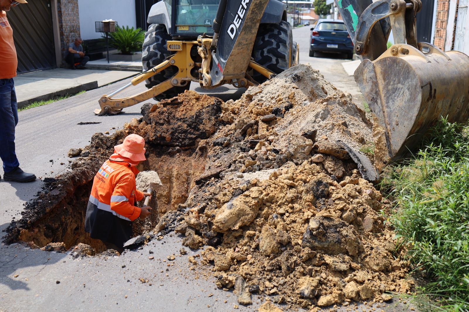 A equipe da área distrital da zona Leste trabalha com o apoio de uma retroescavadeira, abrindo pontos para identificar a obstrução, e em seguida, executar a limpeza e a manutenção da rede de drenagem se estiver danificada.