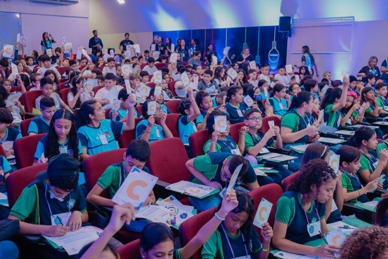 De uma forma muito divertida, alunos do 5º ano do ensino fundamental da Prefeitura de Manaus participaram, na quarta-feira, 4/10, do primeiro dia do “Viradão Saeb”. Esta é a 2ª edição do aulão, que faz parte do programa “Educa+Manaus”, da Secretaria Municipal de Educação (Semed). O evento aconteceu de forma presencial no auditório do órgão, no Parque 10, zona Sul, para 16 escolas e com transmissão ao vivo para mais de 34 mil alunos, que assistiram na própria unidade de ensino. Na quinta-feira, 5/10, será a vez dos alunos do 9º ano.