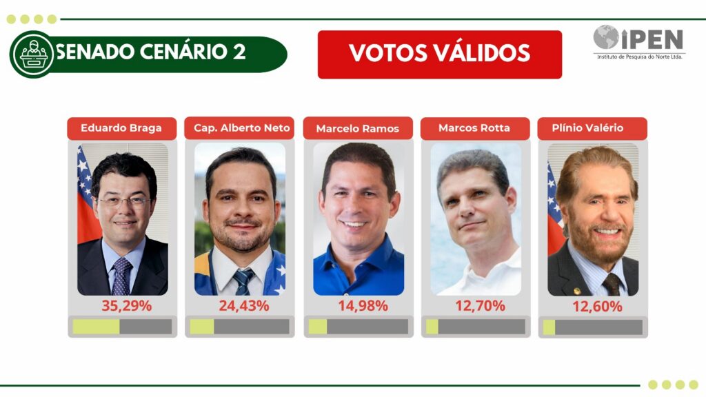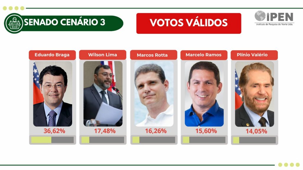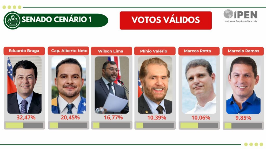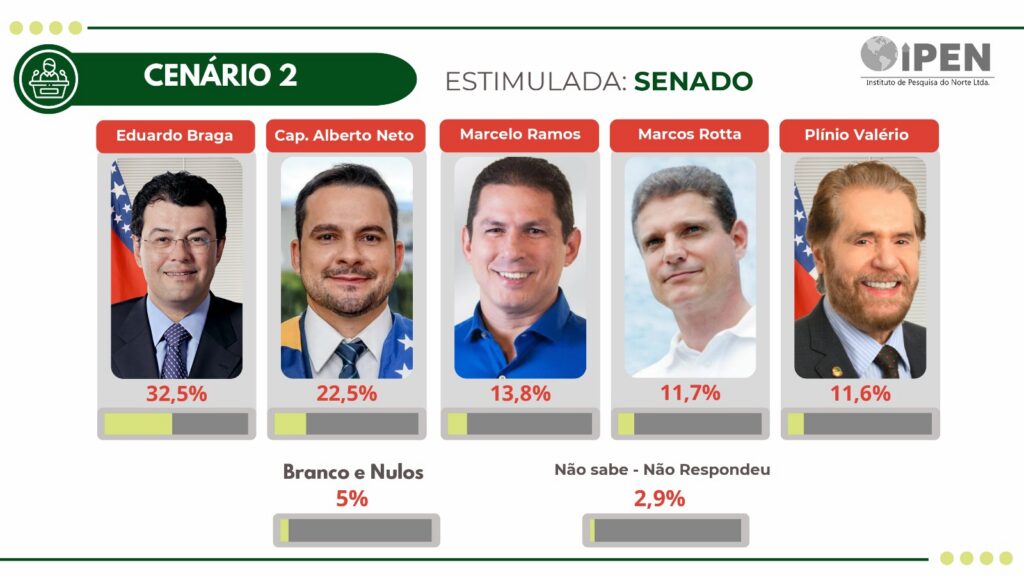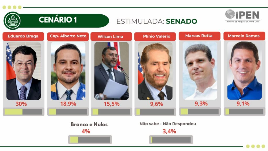 A disputa por uma das duas cadeiras que o Amazonas renovará no Senado Federal em 2026 começa a ganhar contornos mais claros ao longo de 2025. Levantamento do Instituto de Pesquisas do Norte (IPEN), encomendado pelo consórcio de portais G6, aponta que o senador Eduardo Braga (MDB) abriu vantagem expressiva sobre os concorrentes e lidera com folga em todos os cenários testados.