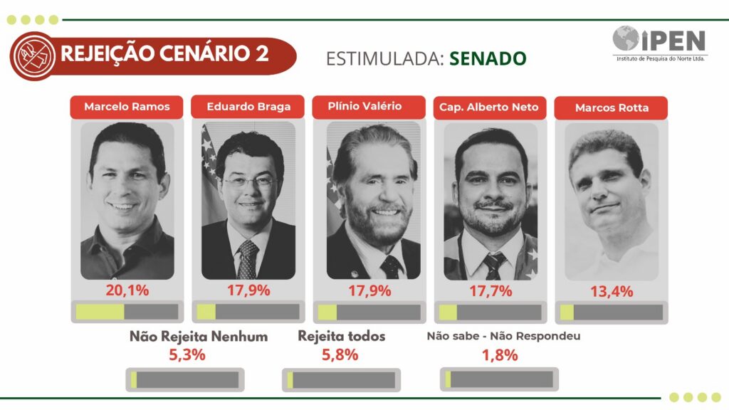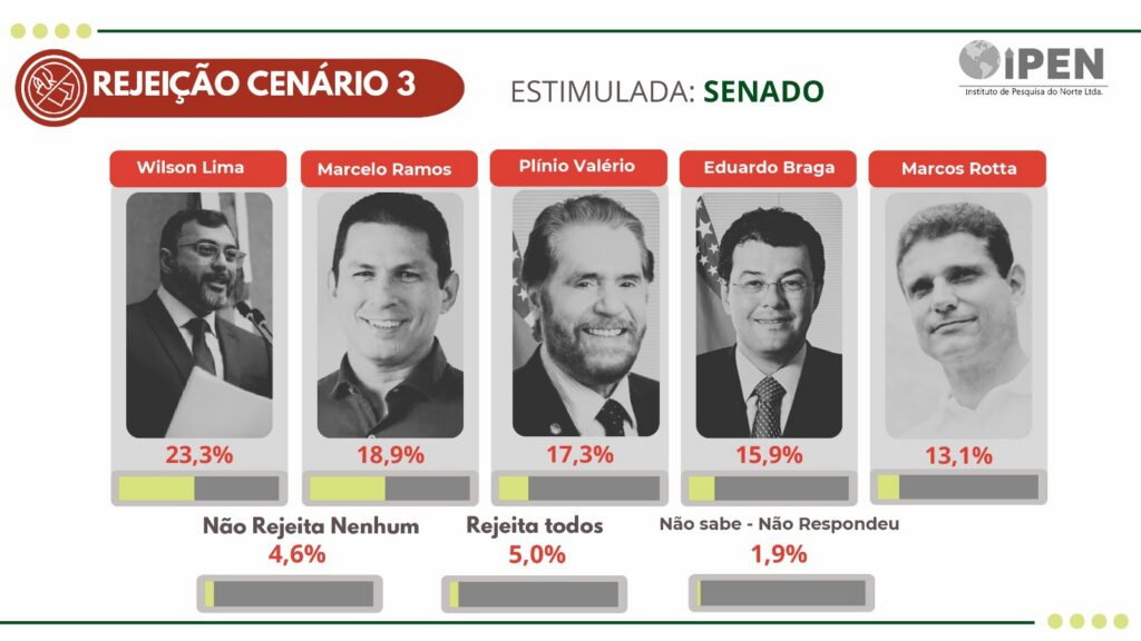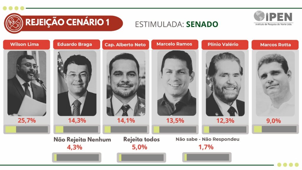 Enquanto isso, o governador Wilson Lima (União), mesmo com a maior rejeição entre os possíveis candidatos, mostra crescimento e se aproxima de Alberto Neto. O movimento reforça a possibilidade de que Lima entre efetivamente na disputa pelo Senado, um cenário que tende a reorganizar o xadrez político do Estado ao longo do ano.