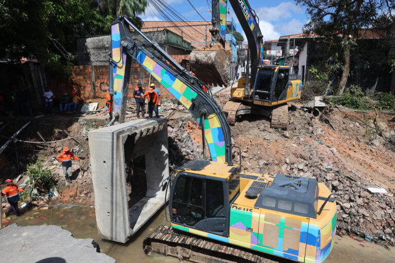 As aduelas têm a função de canalizar de forma correta as águas pluviais, evitando alagamentos ou novos riscos de desmoronamento. No leito do igarapé, 30 trabalhadores seguem com a contenção de rip-rap nas laterais.