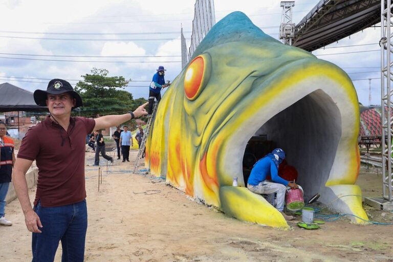 Outro avanço na segunda etapa no parque linear é no cenário amazônico. Os artistas trabalham nas armações de concreto, determinando os detalhes das esculturas, com suas escamas, curvas e características das espécies. Paralelamente, as equipes estão dando forma ao espelho d’água da área molhada.